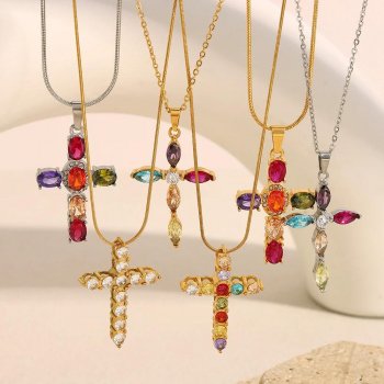 Sparkling Colored Zirconia Cross Pendant Necklace for Women – Waterproof Stainless Steel Jewelry